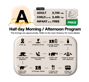 2:35 p.m. – 3.45 p.m.: Walk with Elephants Prepare Elephants’ Favorite Food and Vitamins Enjoy Mud Spa with elephants Bathing and Swimming with Your Elephant Companion